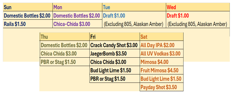 We have some of the best beverage specials in town and a great selection, especially our brews and our whiskies!